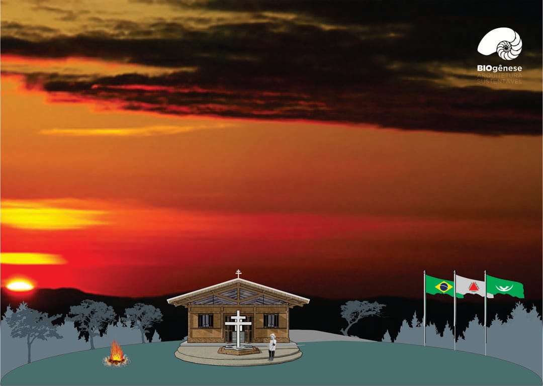 Capela retangular de 96 metros quadrados de área interna. Dimensões de 8m X 12m.