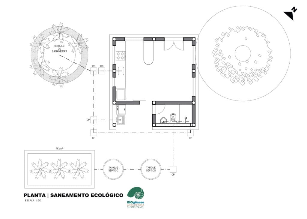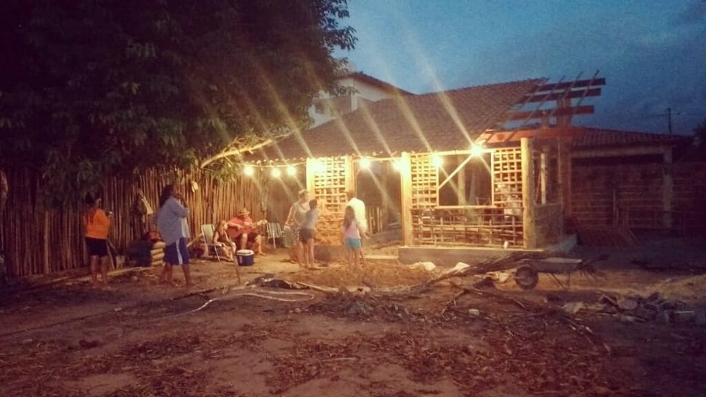 Fundação em concreto ciclópico, estrutura em madeira, alvenaria em pau a pique, rebocos de terra e rebocos de cal, tinta de terra, fossa biodigestora.