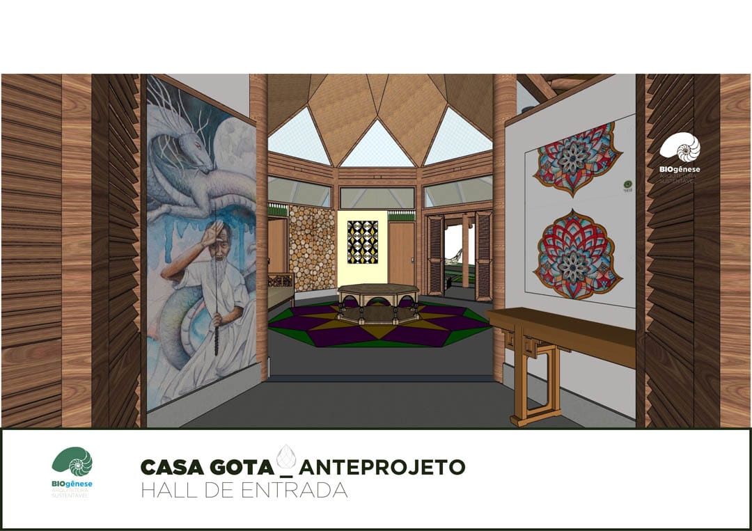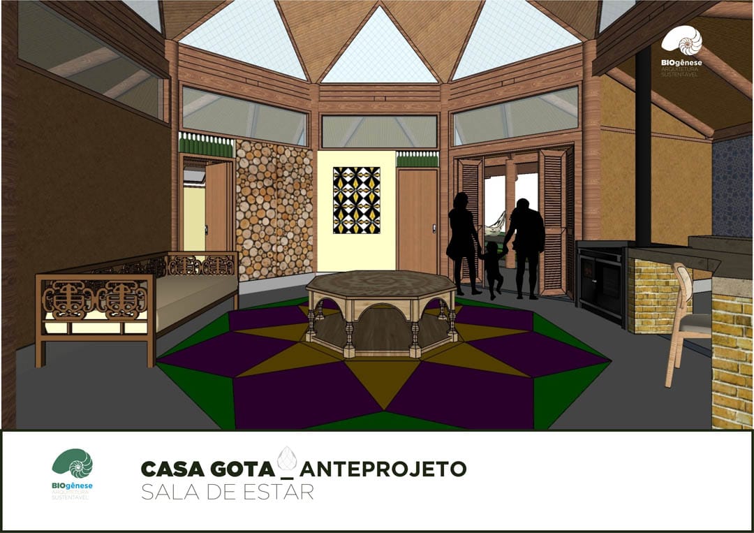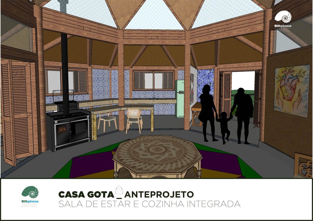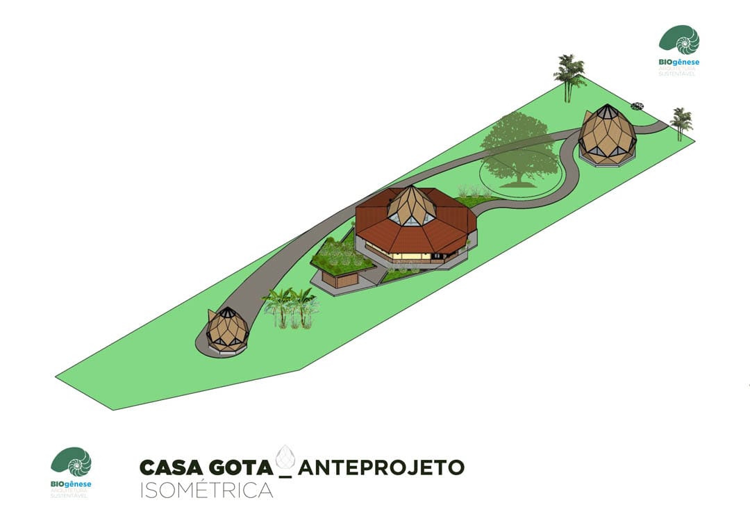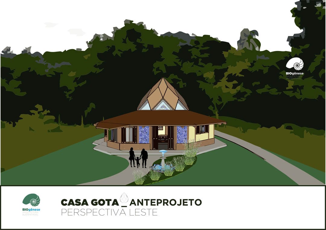 Projeto com Programa de Necessidades contemplando 150m2 bem distribuídos ao longo do terreno. Os ambientes de trabalho e área de serviço estão separados da residência, intercalados com jardins filtrantes, saneamento ecológico, espaços para plantio, áreas livres e contemplação.