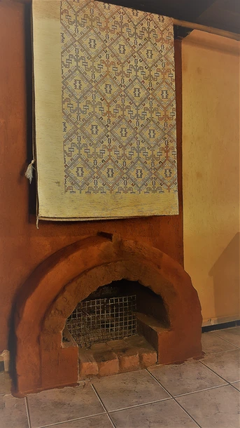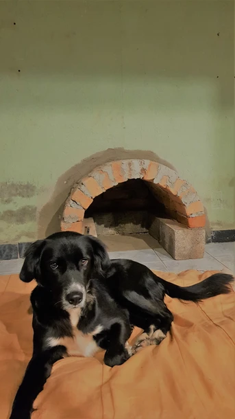 Lareira para residência unifamiliar de 50m2, construída com tijolos maciços, reboco de barro e pintura de terra. Base em concreto.