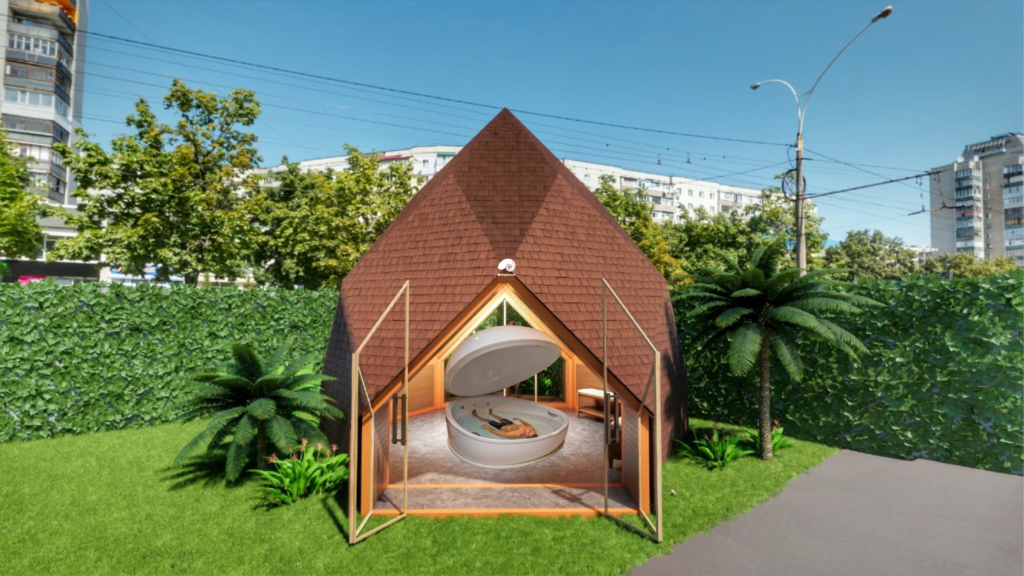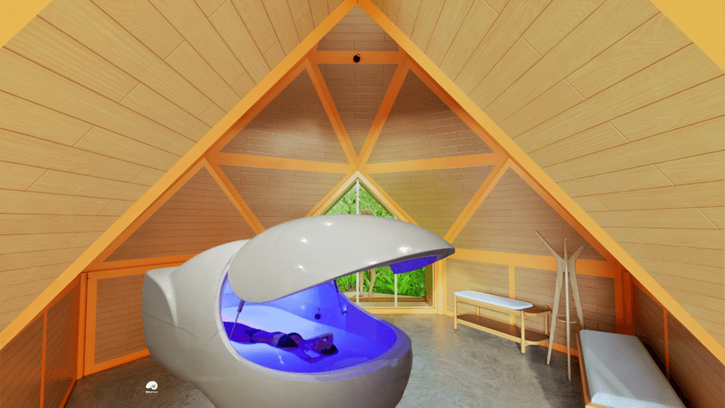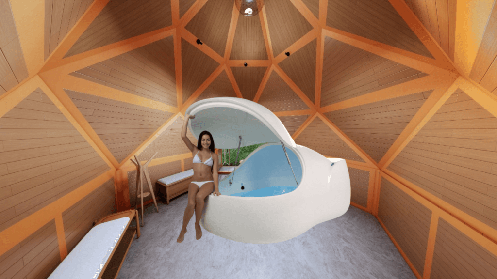 Dentro dessa sala existe um tanque com água aquecida e sais naturais, semelhante a uma banheira futurista.